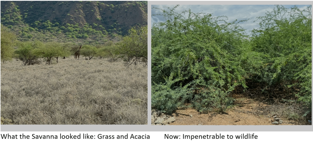 We at RNBS work with rehabilitating degraded Conservation Areas and Savannah Forests, woody-weed infested grasslands invaded by Prosopis Juliflora – designated a top-100 invasive species by UNEP.