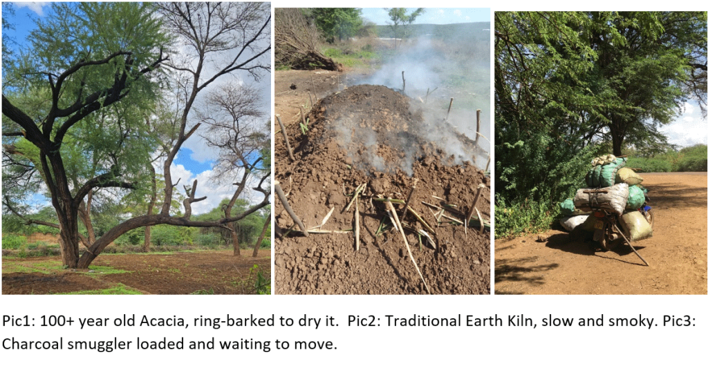 Pic1: 100+ year old Acacia, ring-barked to dry it.  Pic2: Traditional Earth Kiln, slow and smoky. Pic3: Charcoal smuggler loaded and waiting to move.